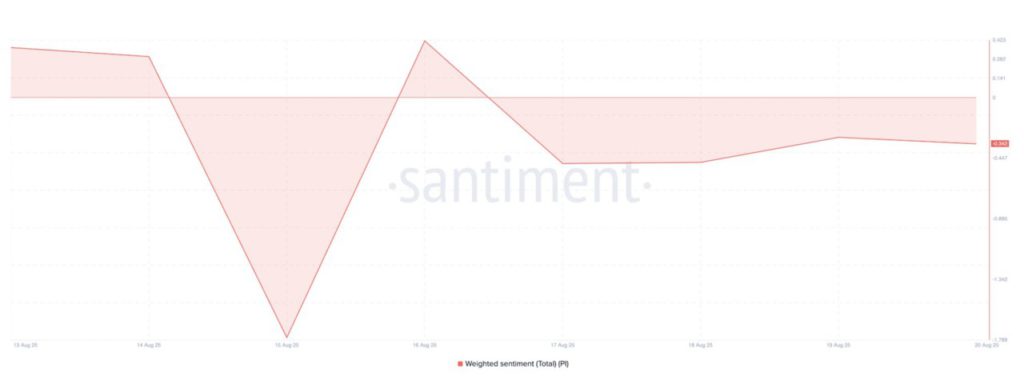 Selain itu, sentimen tertimbang PI tetap negatif sejak awal pekan, memperkuat prospek bearish ini. Saat laporan ini dibuat, sentimen tertimbang berada di level -0,342.