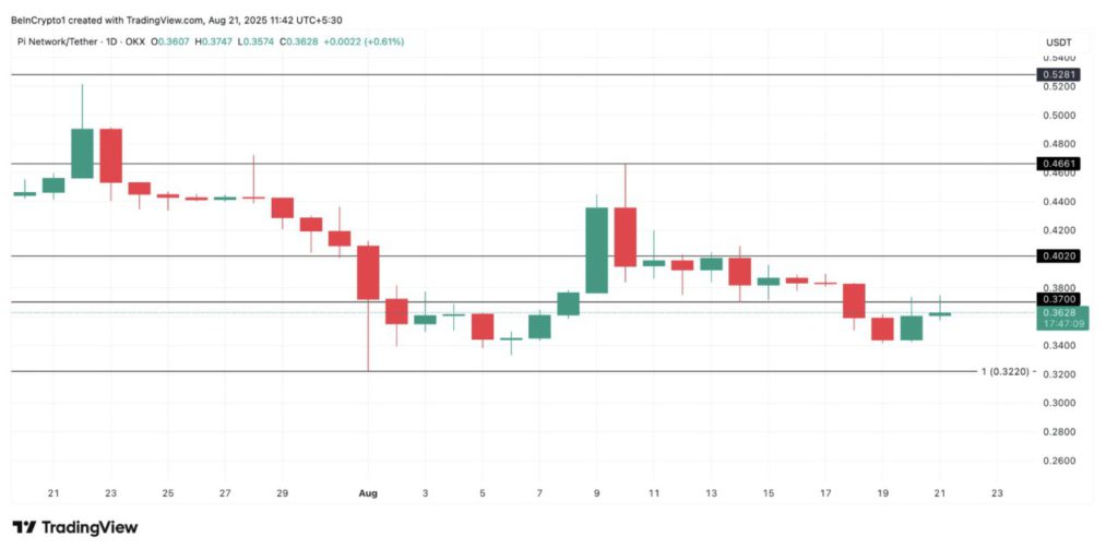 Jakarta, Pintu News – Dilansir dari BeInCrypto (21/8), sejak awal pekan, token asli Pi Network, PI, bergerak mendatar dan menghadapi level resistensi baru di kisaran $0,37 yang sebelumnya menjadi area support.
