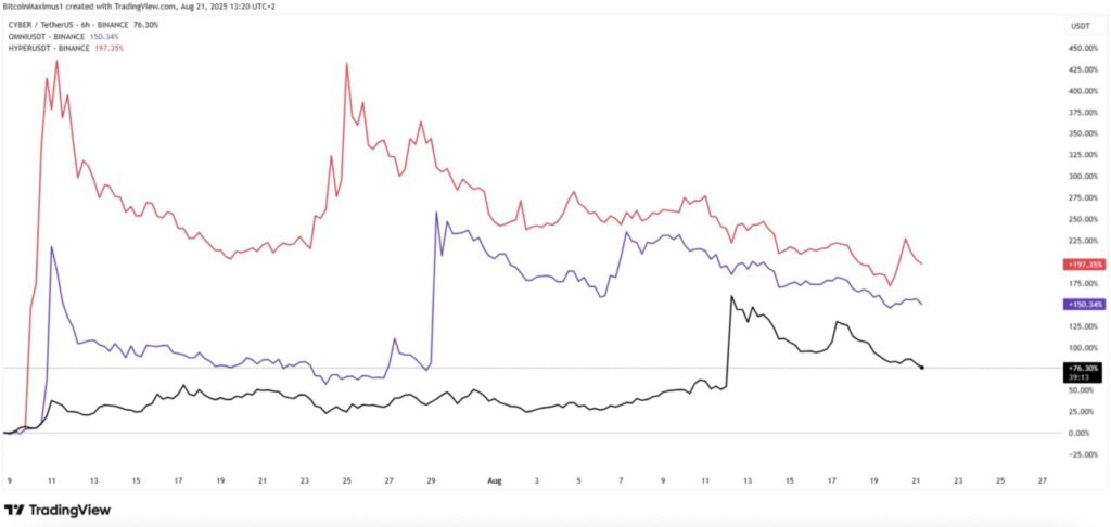 Analisis terhadap tiga aset sebelumnya yang sempat mengalami lonjakan setelah listing di Upbit ā Hyperlane (HYPER), Omni Network , dan CYBER ā menunjukkan bahwa tidak ada satupun yang mampu melampaui level tertingginya pasca listing.
