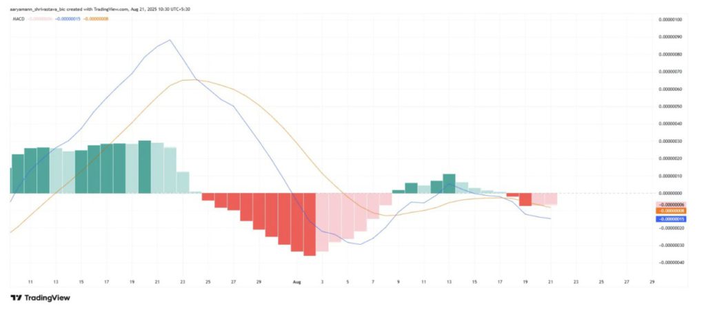 Dari sisi teknikal, momentum makro Shiba Inu menunjukkan prospek bearish, dengan indikator MACD saat ini memperlihatkan terjadinya bearish crossover. Sinyal ini menandakan pergeseran momentum ke arah penjual, di mana tekanan jual lebih dominan dibandingkan minat beli.