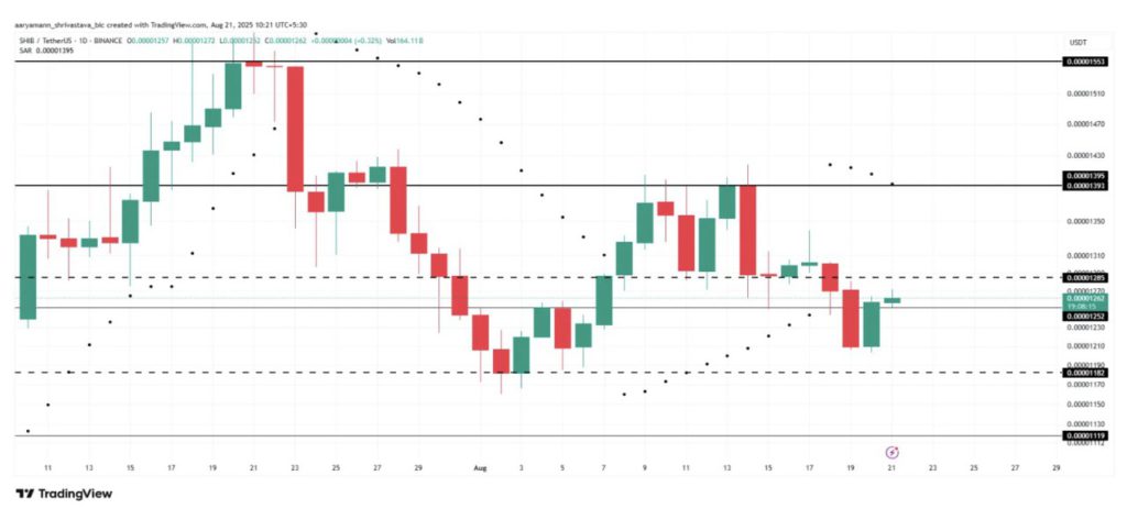 Per 21 Agustus, harga Shiba Inu berada di $0,00001262, dengan upaya untuk mempertahankan $0,00001252 sebagai level support.