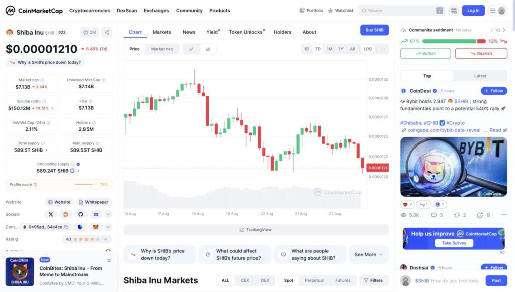 Menariknya, meski harga terkoreksi, sentimen komunitas masih didominasi optimisme. Dari lebih dari 1 juta suara, sekitar 87% menyatakan bullish sementara hanya 13% yang bearish. Hal ini mencerminkan kepercayaan komunitas crypto bahwa Shiba Inu (SHIB) masih memiliki potensi pergerakan jangka panjang, terlebih dengan dukungan ekosistem Shibarium dan adopsi yang semakin meluas.