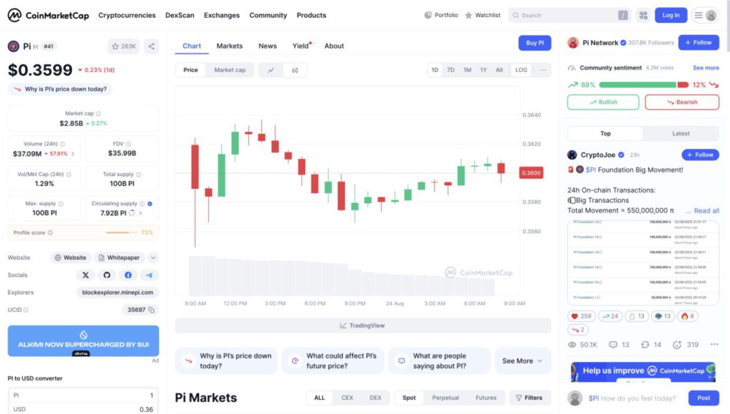 Dari sisi data pasar, kapitalisasi Pi berada di kisaran $2,85 miliar, naik tipis 0,27% meskipun harga sedang terkoreksi. Sementara itu, volume perdagangan 24 jam justru turun signifikan sebesar 57,91%, menjadi hanya $37,09 juta, menunjukkan berkurangnya minat transaksi jangka pendek. Dari sisi suplai, Pi memiliki total dan maksimal suplai 100 miliar PI, dengan 7,92 miliar PI sudah beredar di pasar.