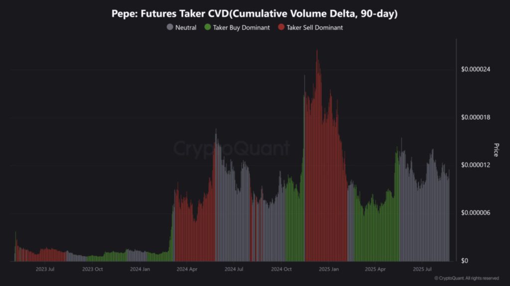 Jika diteliti lebih dalam, lonjakan harga PEPE ternyata terutama digerakkan oleh aktivitas di pasar spot. Data dari CryptoQuant menunjukkan bahwa Futures Taker CVD netral selama tiga bulan terakhir.
