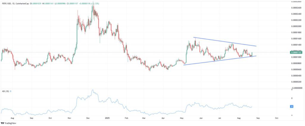 Pada grafik harian (23/8), PEPE terlihat bergerak di dalam pola segitiga simetris yang terbentuk sejak awal Mei dan kini mendekati titik puncaknya.