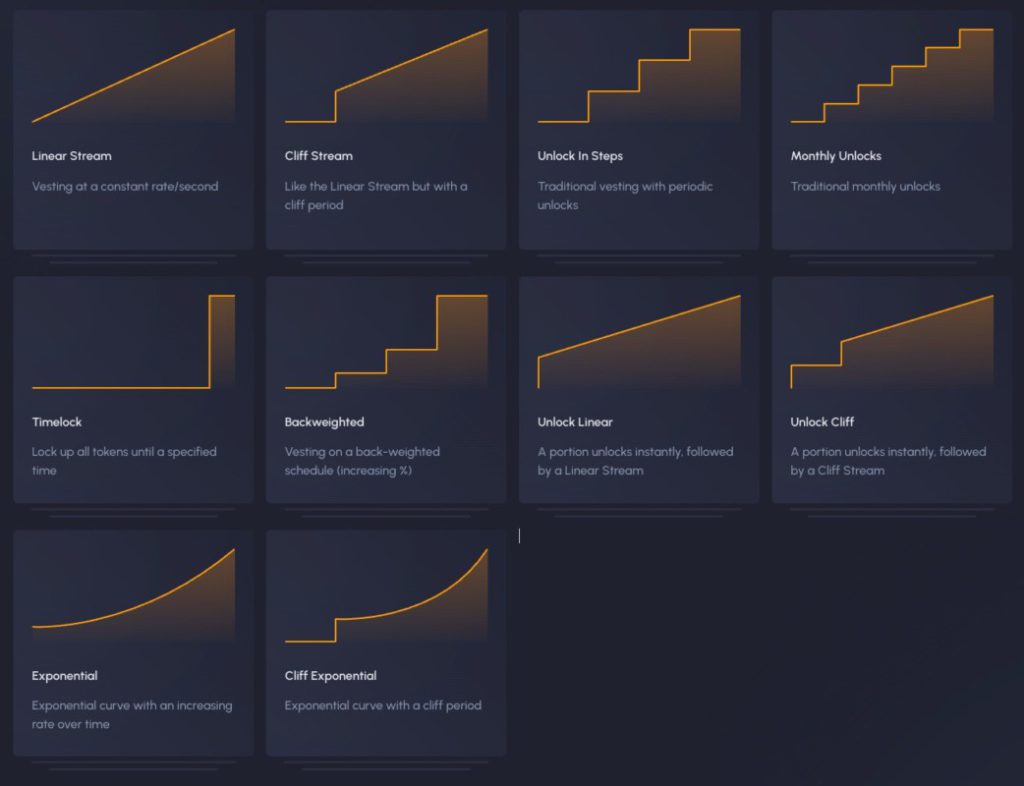 Ada beberapa jenis jadwal vesting yang dapat diimplementasikan oleh proyek, masing-masing dengan aturan dan garis waktu tersendiri. Pilihan jadwal vesting dapat mempengaruhi sentimen investor dan keberlanjutan jangka panjang proyek.