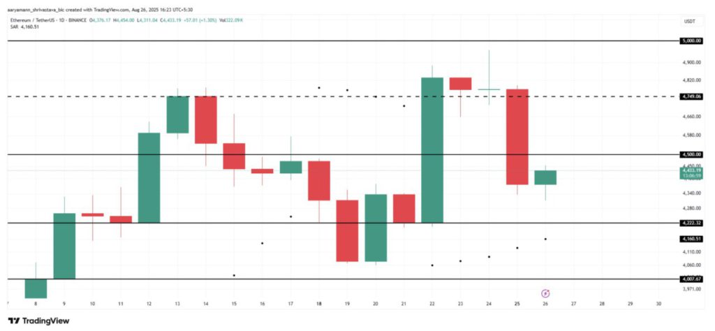 Pada 26 Agustus, Ethereum sempat diperdagangkan di harga $4.433, berada di bawah level resistansi $4.500. Aset ini gagal merebut kembali level tersebut sebagai support, yang mengindikasikan kelemahan dalam mempertahankan level yang lebih tinggi.
