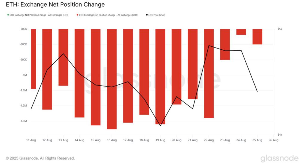 Perubahan posisi bersih di bursa semakin menyoroti aktivitas penjualan. Investor beralih dari akumulasi ke distribusi, dengan 521.000 ETH senilai lebih dari $2,3 miliar yang dikirim ke bursa dalam seminggu terakhir.