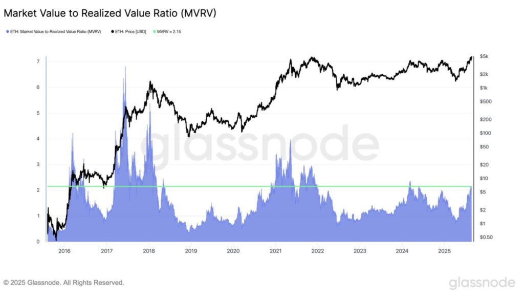 Rasio MVRV untuk Ethereum telah naik menjadi 2,15, menunjukkan bahwa rata-rata, investor saat ini memiliki keuntungan yang belum direalisasikan sebesar 2,15 kali lipat dari modal awal mereka.