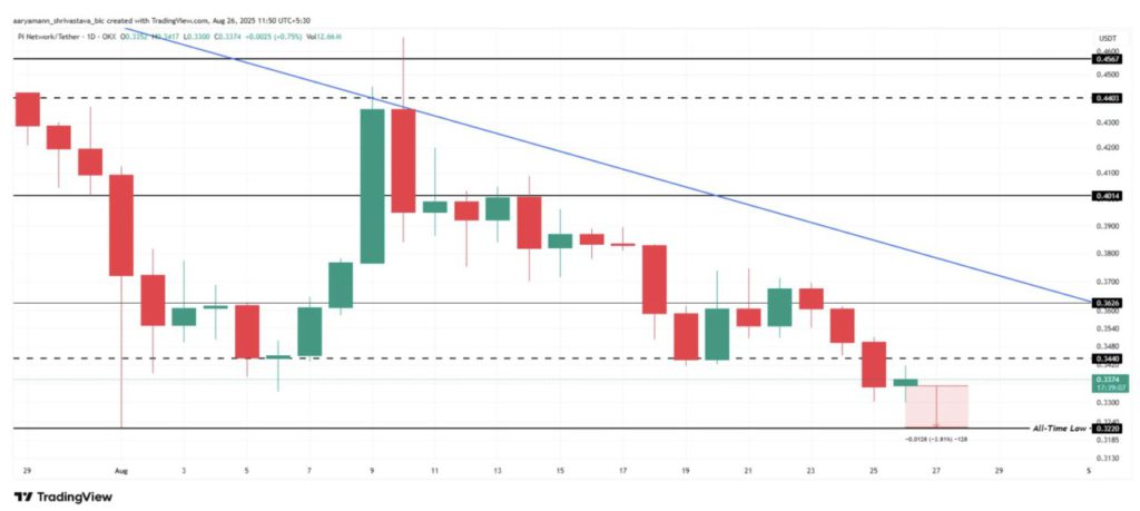 Per 26 Agustus, Pi Coin sempat diperdagangkan di harga $0,337, setelah jatuh di bawah zona support krusial $0,344. Level tersebut telah memberikan kestabilan sejak awal bulan, namun penurunan terbaru ini menunjukkan adanya kelemahan yang kembali muncul.