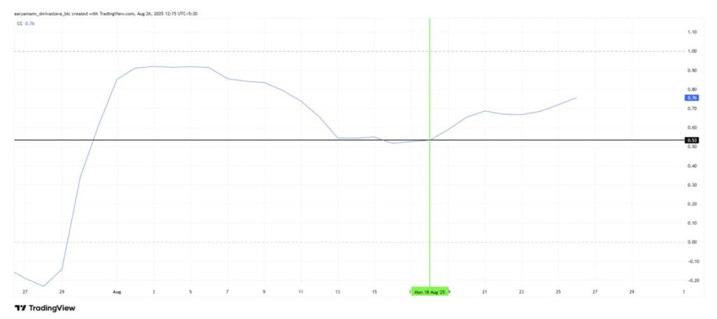 Aksi harga Pi Coin semakin mencerminkan pergerakan Bitcoin dalam seminggu terakhir. Korelasi antara kedua aset digital ini meningkat tajam, dari 0,53 menjadi 0,76.