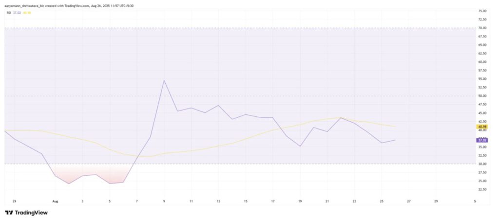 Sinyal teknikal terus menunjukkan pandangan bearish untuk Pi Coin. Relative Strength Index (RSI) berada di bawah angka netral 50, mencerminkan kelemahan secara keseluruhan. Meskipun indikator ini belum mencapai kondisi oversold, posisinya saat ini menyoroti momentum penurunan yang semakin kuat pada struktur harga altcoin ini.