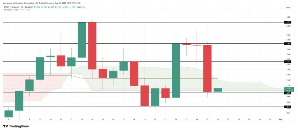 Ether.fi sempat diperdagangkan di $1.10 pada 26 Agustus, menunjukkan optimisme meskipun ada volatilitas terbaru. Berbeda dengan altcoin lain yang mengalami penurunan linear, pergerakan ETHFI cenderung datar dengan fluktuasi yang lebih tajam.