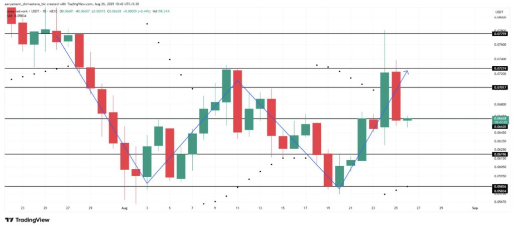 Pada 26 Agustus, PEAQ sempat diperdagangkan di harga $0.066, dengan pola double bottom, yang sering disebut sebagai formasi āWā, berkembang di grafik. Pola teknikal ini secara historis menunjukkan potensi momentum naik. Struktur ini menunjukkan bahwa altcoin ini bisa mengalami kekuatan harga yang berkelanjutan.