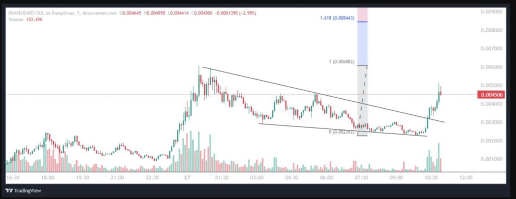 Per 27 Agustus, harga Braveheart berhasil menembus pola descending wedge dengan volume transaksi yang signifikan — mengisyaratkan kemungkinan berakhirnya fase koreksi harga.