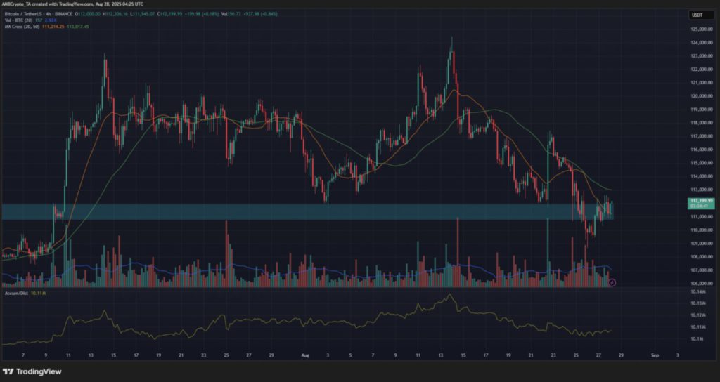 Jakarta, Pintu News – Pada 28 Agustus, Bitcoin sempat diperdagangkan di level $112.1K, mengalami kenaikan tipis. Mengutip laporan AMB Crypto, aksi harga jangka pendek menunjukkan kecenderungan bearish, meskipun masih ada peluang untuk rebound menuju $115K.