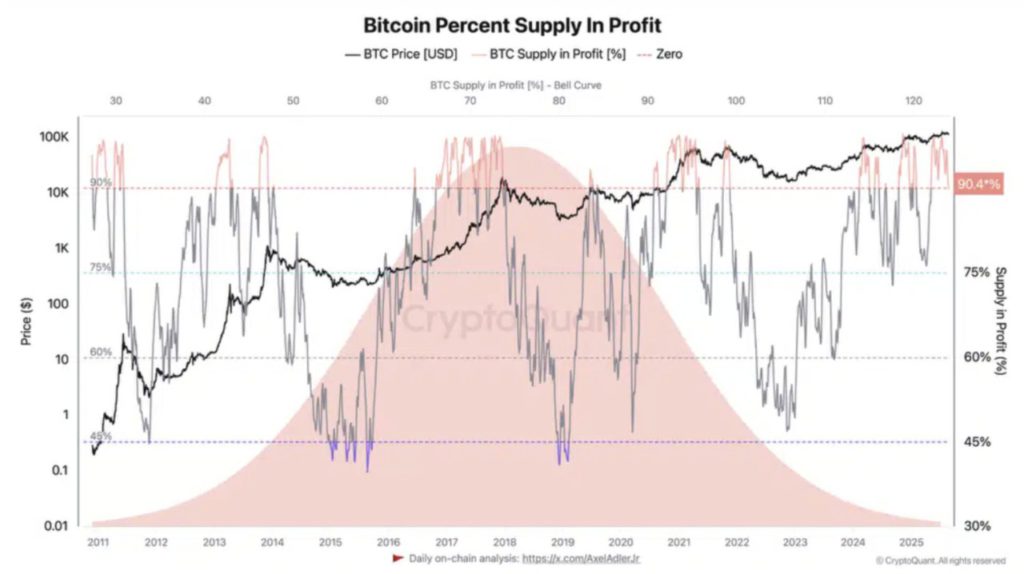 Dalam sebuah unggahan di CryptoQuant, analis Darkfost menyoroti bahwa persentase pasokan Bitcoin yang berada dalam posisi untung telah mencapai 90%. Angka ini dianggap sebagai ambang penting yang kerap menyertai pasar bullish.