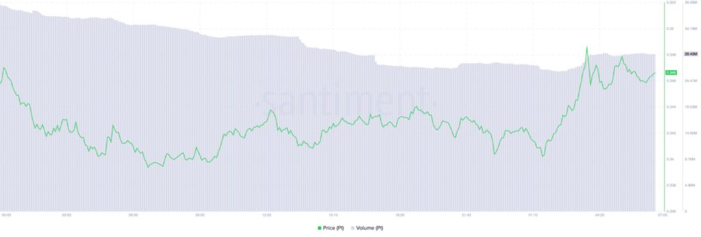 Dalam kondisi pasar normal, peningkatan harga biasanya diikuti oleh lonjakan volume perdagangan yang mencerminkan minat beli dari pelaku pasar. Namun berdasarkan data dari platform analitik Santiment yang dikutip oleh BeInCrypto, volume perdagangan harian PI justru turun hingga 20%.