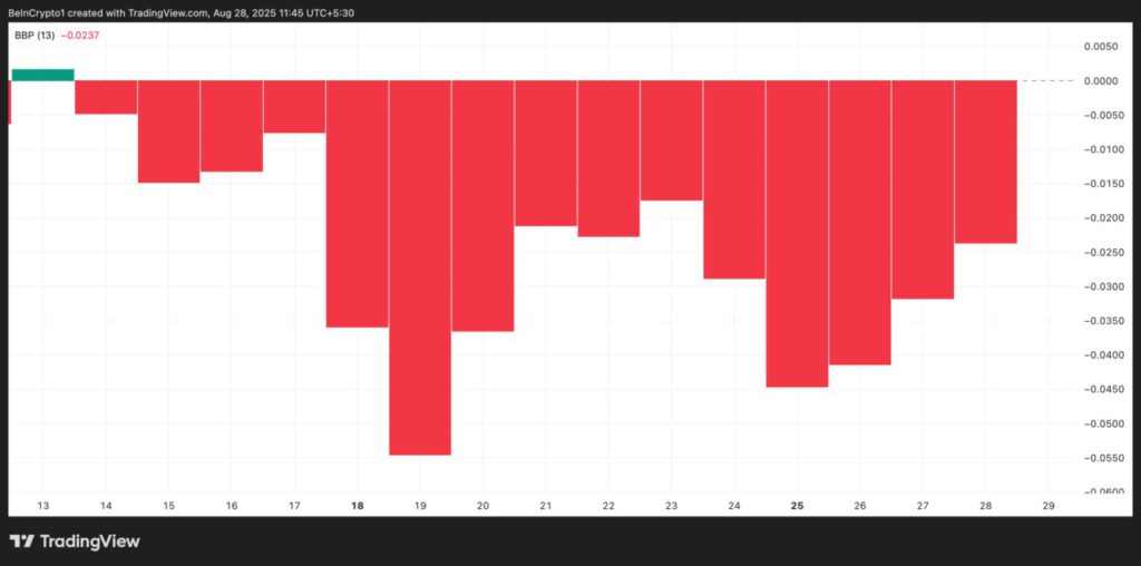 Indikator teknikal Elder-Ray digunakan untuk mengukur kekuatan pembeli dan penjual dalam pasar crypto. Dalam laporan yang sama, indeks Elder-Ray PI tercatat berada pada angka -0.0237 per 28 Agustus 2025, yang menandakan bahwa kekuatan penjual (bear power) masih mendominasi.