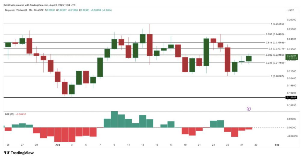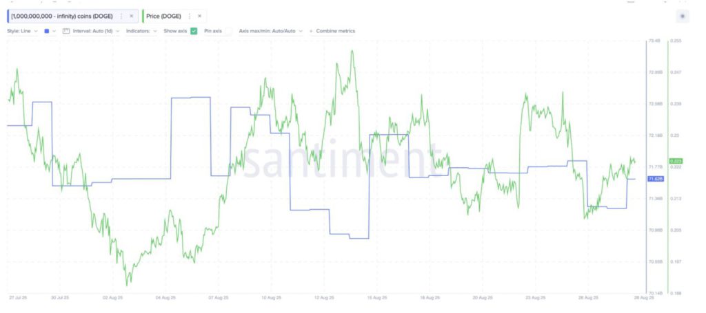 Pergerakan ini menarik perhatian para pemegang besar. Antara tanggal 27 dan 28 Agustus, dompet super besar (berisi 1 miliar DOGE atau lebih) meningkatkan kepemilikan mereka dari 71,24 miliar menjadi 71,62 miliar DOGE — kenaikan sebesar 0,53%, yang nilainya sekitar $84 juta pada harga $0,2230. Akumulasi seperti ini menjadi alasan kuat mengapa DOGE layak dipantau di bulan September.