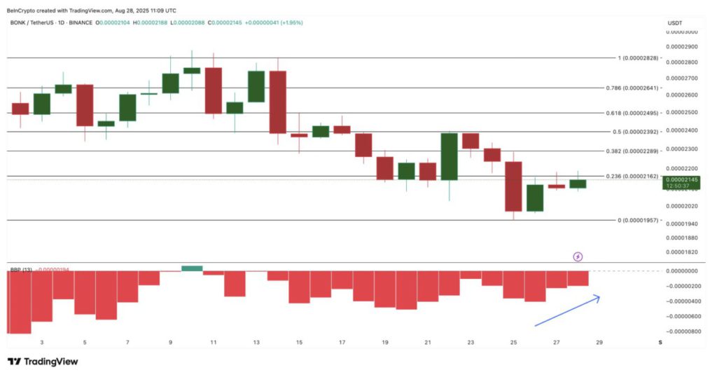 Namun, jika harga turun di bawah $0,0000195, maka skenario bullish akan gugur. Dengan indikator Bull Bear Power (BBP) menunjukkan pelemahan tekanan jual, BONK tampaknya semakin siap untuk potensi kenaikan harga di bulan September.