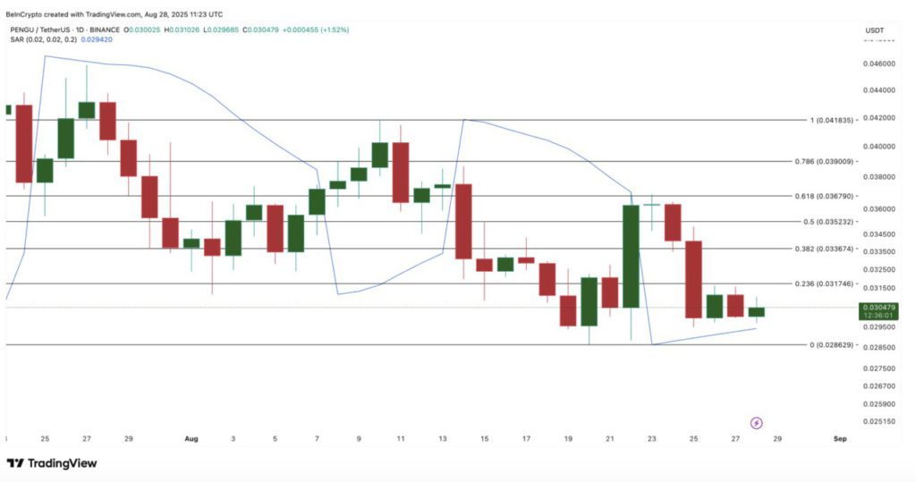 Secara teknikal, indikator Parabolic SAR — indikator tren yang menempatkan garis di atas atau di bawah harga untuk menunjukkan arah momentum — telah berbalik menjadi bullish dan kini muncul di bawah candle harga PENGU. Jika dikombinasikan dengan reli 174% dalam tiga bulan terakhir, tren naik ini masih terjaga.