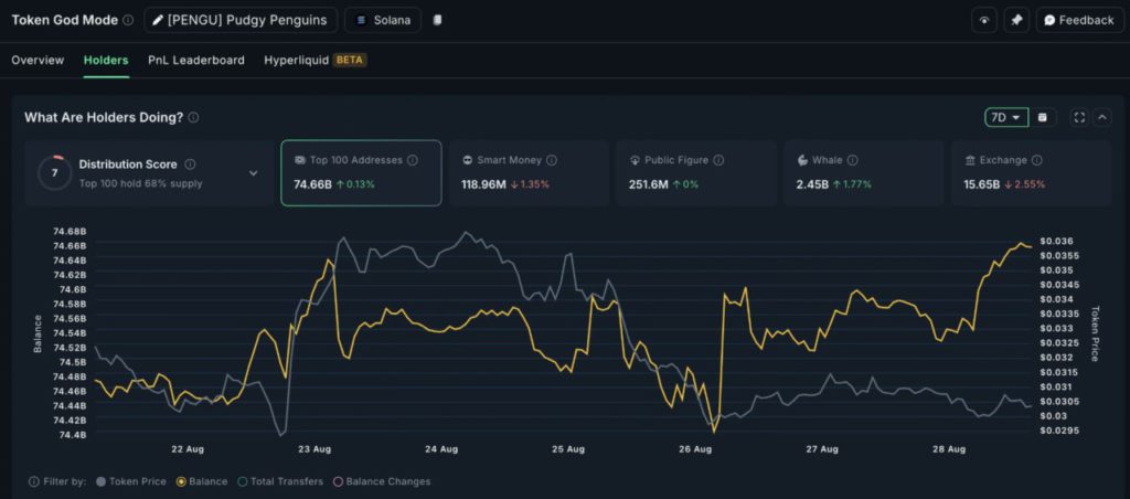 Kepemilikan whale meningkat 1,77% menjadi 2,45 miliar PENGU, sementara 100 alamat teratas menambahkan 0,13% hingga mencapai 74,66 miliar. Dengan harga $0,030, akumulasi oleh pemegang besar ini bernilai sekitar $4,2 juta.