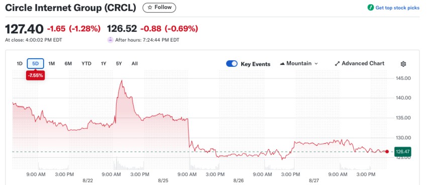 Beberapa bank dan pengecer juga sedang mengeksplorasi model pembayaran berbasis token. Pada hari yang sama, saham Circle (CRCL) ditutup pada $127,4, turun 1,28% dari sesi sebelumnya. Penurunan ini terjadi di tengah penarikan pasar yang lebih luas, dengan Bitcoin turun 0,7% selama 24 jam menjadi $111.277 dan Ethereum turun 2,2% menjadi $4.511.