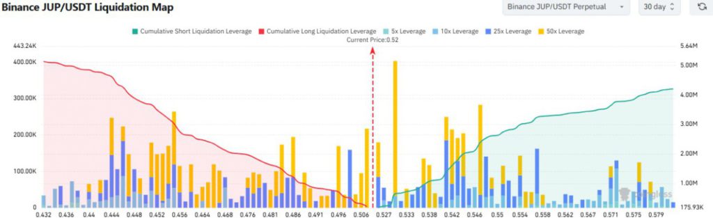 Pada grafik harian, ditemukan bahwa Jupiter (JUP) diperdagangkan dalam kisaran jangka panjang yang telah ditetapkan. Kisaran ini berada antara $0,33 hingga $0,63 dengan titik tengah di $0,48, yang saat ini sedang diperebutkan oleh para pembeli dan penjual.