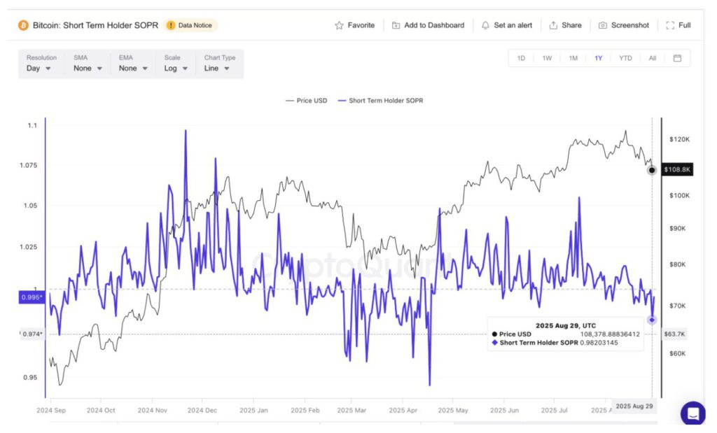 Spent Output Profit Ratio (SOPR) mengukur apakah koin yang dipindahkan di jaringan blockchain dijual dalam kondisi untung atau rugi. Untuk pemegang jangka pendek—yang biasanya paling reaktif—metrik ini menjadi indikator sentimen pasar secara hampir real-time.