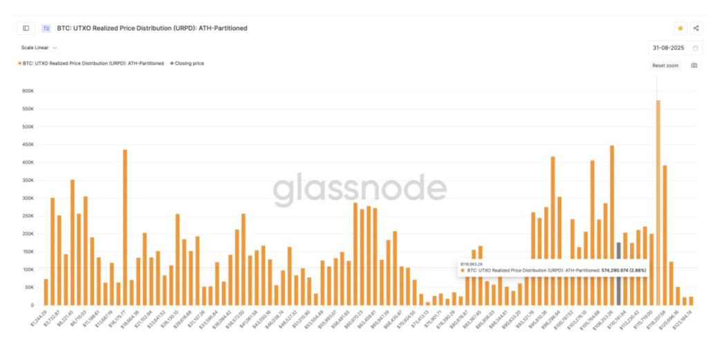 Namun di sisi atas, resistensi terbentuk dengan cepat. Level $113.200 (dekat dengan area kunci $113.500) memuat 210.708 BTC (1,06%), dan $114.400 memuat 220.562 BTC (1,11%). Hambatan paling signifikan ada di $116.900, di mana 2,88% dari total suplai terakhir berpindah tangan — menjadikannya dinding resistensi paling kuat di wilayah ini.