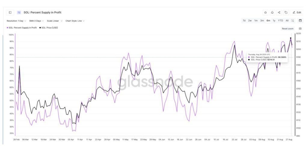 Kemudian, pada 23 Agustus, puncak lainnya pada 95,13% menyebabkan penurunan 8% dari $204 menjadi $187. Dengan metrik ini kembali mendekati rekor tertinggi, risiko koreksi yang lebih dalam pada harga Solana (SOL) di bulan September semakin meningkat.