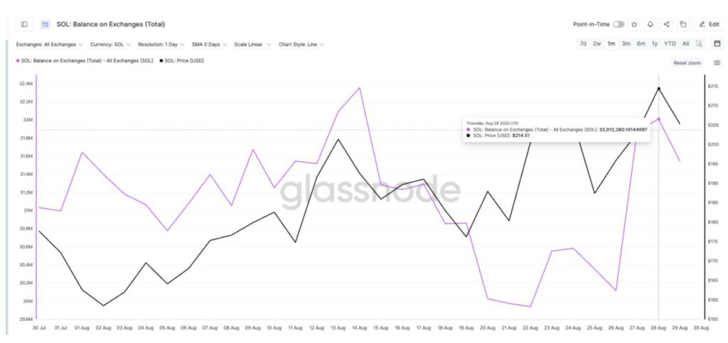 Risiko penjualan tersebut diperkuat oleh saldo Solana (SOL) di bursa. Jumlah Solana (SOL) yang disimpan di bursa pusat melonjak menjadi lebih dari 32 juta token pada 28 Agustus, naik dari kurang dari 30 juta di awal bulan.
