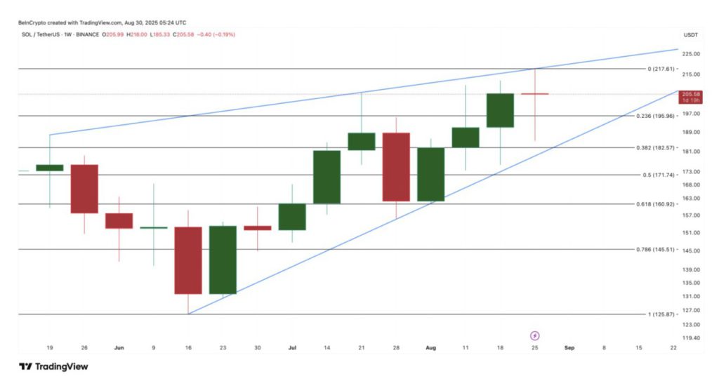 Dari sisi teknikal, setup bearish juga terlihat jelas. Solana (SOL) bergerak dalam pola wedge naik pada grafik mingguan ā pola yang sering menandakan momentum yang melemah dan dapat mengarah pada kelanjutan bearish atau pembalikan.