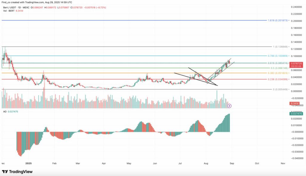 Hal ini mengindikasikan adanya momentum bullish yang meningkat pada meme coin tersebut. Jika tren ini berlanjut hingga September 2025, harga BERT berpotensi melonjak dan mencapai $0,20.