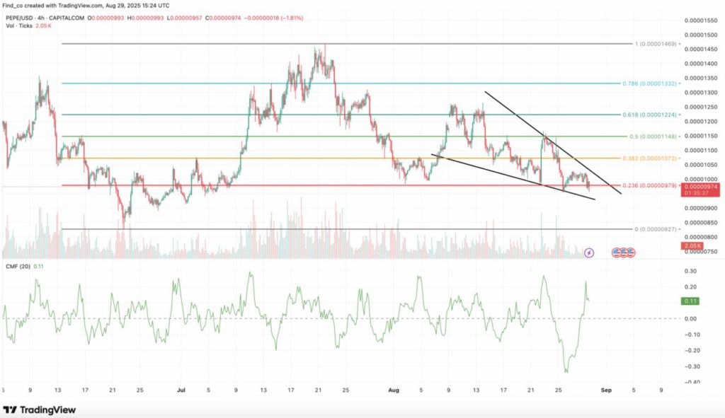 Pada grafik 4 jam (31/8), PEPE membentuk pola falling wedge, yaitu pola pembalikan bullish. Menambah prospek positif ini, indikator Chaikin Money Flow (CMF) telah naik melewati garis nol, yang menandakan adanya tekanan beli yang meningkat.