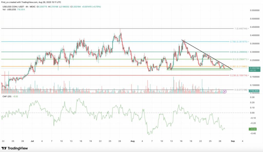 Per 31 Agustus, USELESS diperdagangkan di harga $0,20. Pada grafik 4 jam (31/8), token ini telah membentuk pola double bottom, yang merupakan sinyal pembalikan tren bullish.