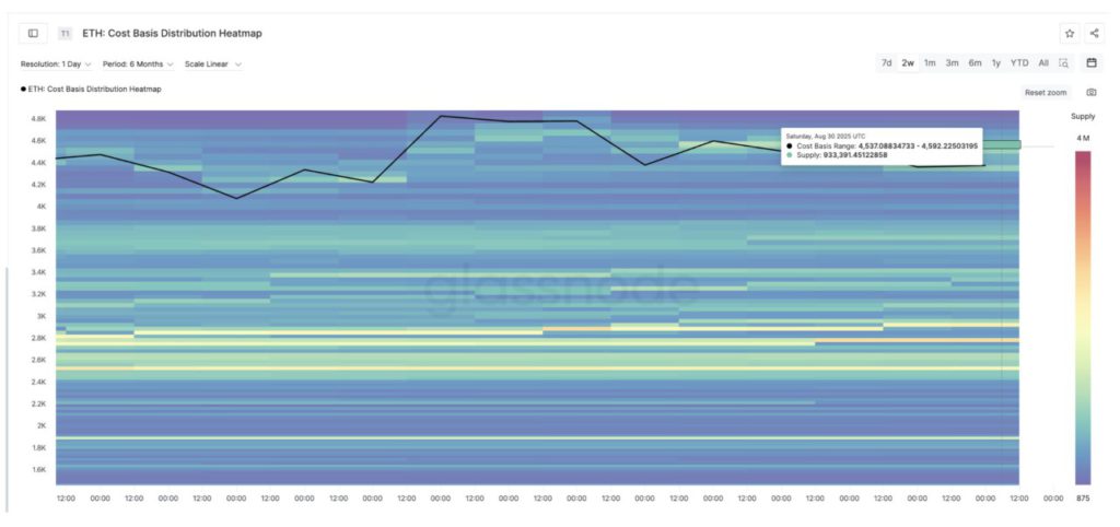 Metrik penting lainnya adalah Cost Basis Heatmap, yang menunjukkan di mana ETH terakhir kali diakumulasi. Zona-zona ini sering kali berfungsi sebagai area support atau resistance alami.