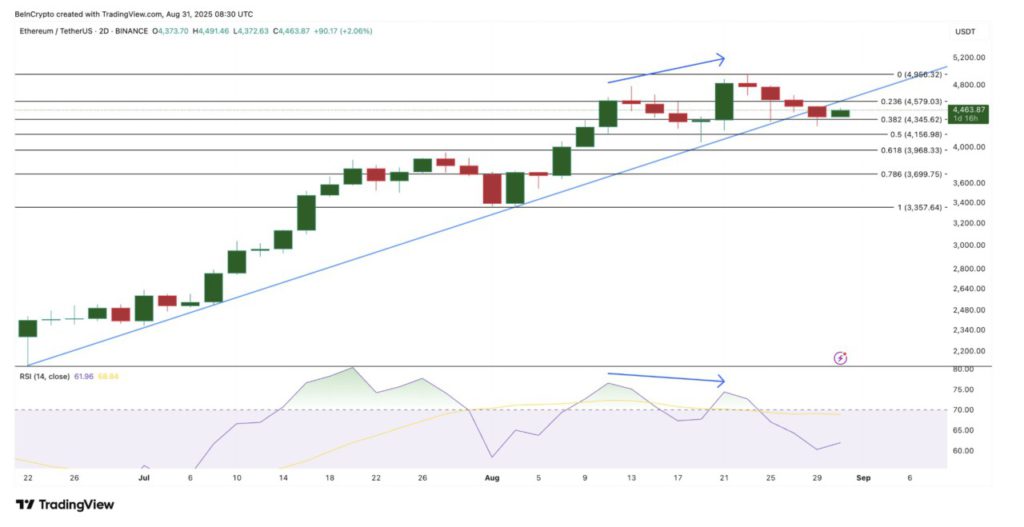 Di masa lalu, level serupa telah memicu koreksi harga. Pada 17 Agustus, ketika NUPL mencapai 0,63, harga ETH turun dari $4.475 menjadi $4.077 (turun 8,9%). Kemudian di bulan yang sama, saat NUPL menyentuh 0,66, harga ETH kembali turun dari $4.829 menjadi $4.380 (turun 9,3%). Hal ini menunjukkan bahwa bulan September berpotensi menghadirkan volatilitas atau pergerakan harga yang terbatas dalam kisaran tertentu.