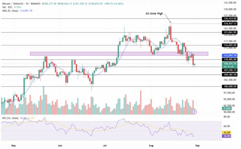 Bitcoin (BTC) saat ini diperdagangkan sekitar $108.876 menurut data dari CoinMarketCap, menunjukkan kenaikan intraday yang moderat sebesar 0,46%. Namun, gambaran yang lebih besar menunjukkan adanya penarikan yang berkelanjutan karena Bitcoin (BTC) terus mencatatkan puncak yang lebih rendah sejak mencapai harga tertinggi sepanjang masa di $126.414.