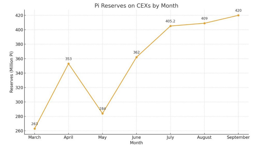 Tanda peringatan pertama adalah bahwa cadangan Pi di bursa terpusat (CEX) telah mencapai rekor tertinggi, melampaui 420 juta PI, menurut data dari Piscan. Pada pertengahan Agustus, BeInCrypto melaporkan terdapat 409 juta PI di bursa, yang berarti lebih dari 11 juta PI telah dipindahkan ke CEX hanya dalam waktu dua minggu.