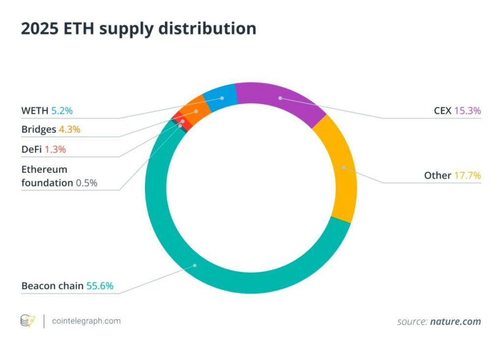 Jakarta, Pintu News – Kepemilikan Ethereum semakin terkonsentrasi di tangan institusi dan smart contract pada tahun 2025. Berdasarkan laporan Cointelegraph, sekitar 70% dari total suplai ETH dikuasai oleh 10 alamat dompet terbesar, yang mayoritas merupakan smart contract staking dan dompet institusi. Siapa saja pemilik terbesar ETH dan berapa jumlahnya? Inilah daftar lengkapnya berdasarkan data on-chain hingga Agustus 2025.