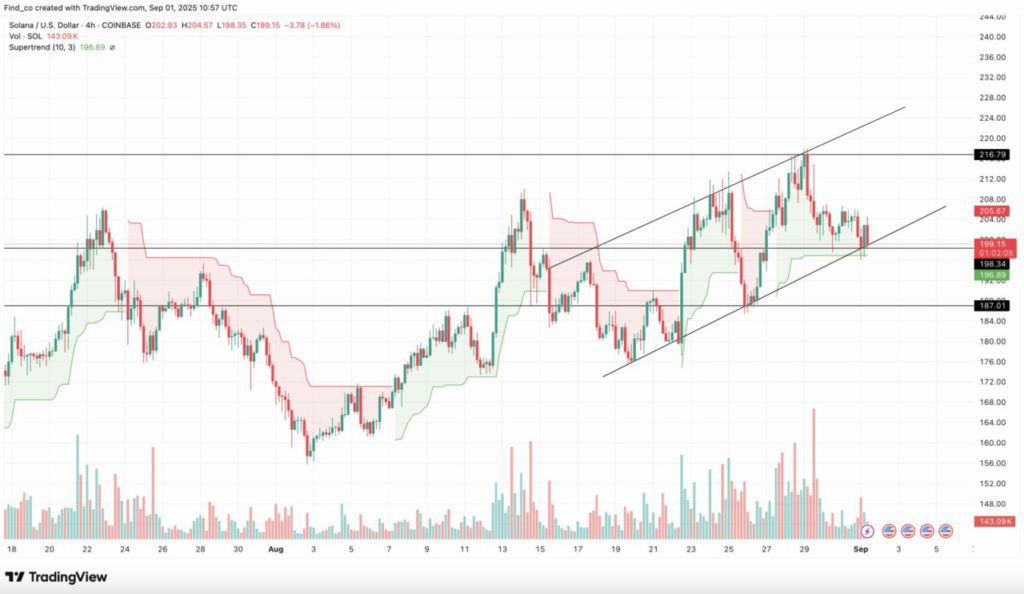 Seiring perkembangan ini, grafik 4 jam (1/9) menunjukkan bahwa Solana masih diperdagangkan dalam pola channel naik, yang memperkuat struktur bullish jangka pendeknya. Selain itu, garis hijau dari indikator Supertrend berada di bawah harga saat ini.