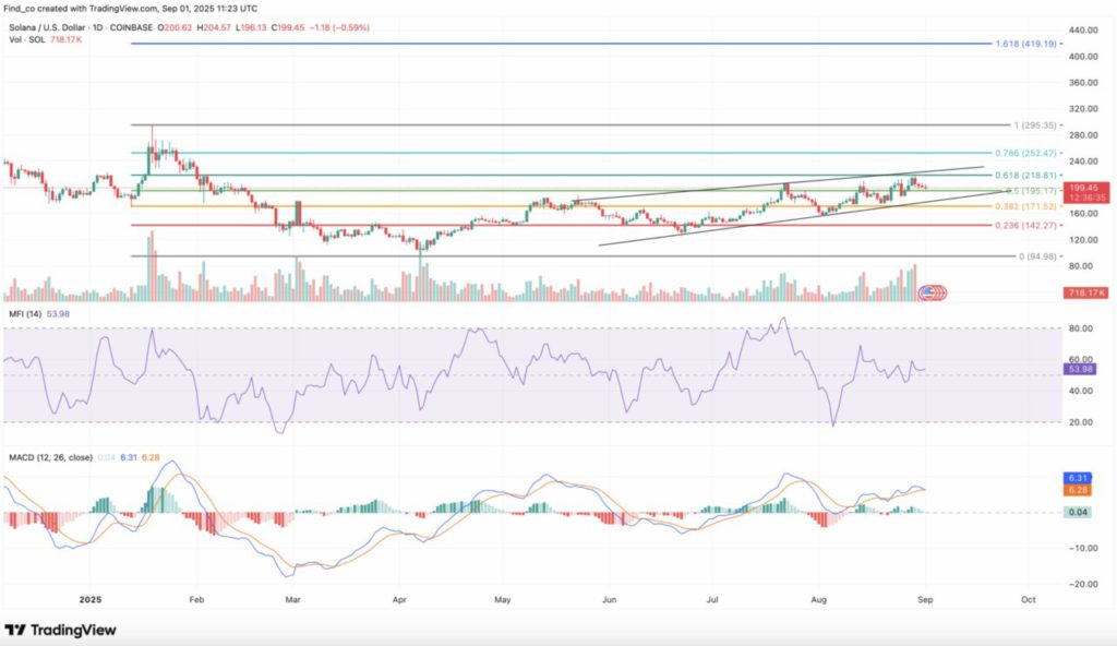 Melihat proyeksi jangka panjang, grafik harian menunjukkan bahwa harga Solana masih bertahan di atas garis support utama, yang menjaga struktur bullish secara keseluruhan tetap utuh.