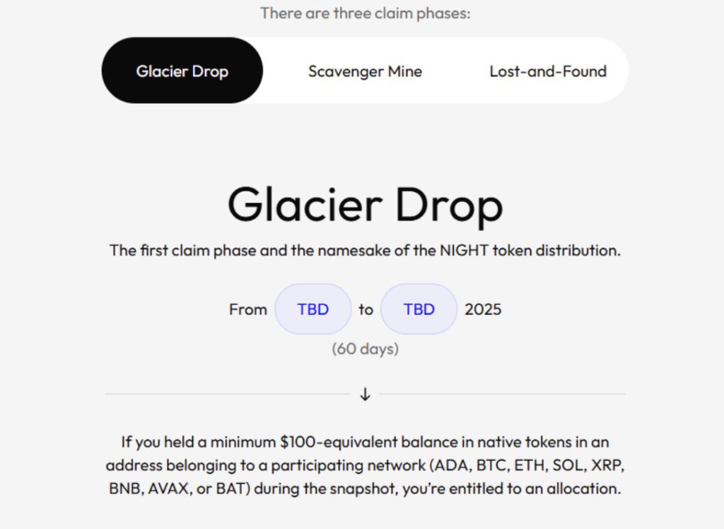 Jakarta, Pintu News – Mengutip laporan BeInCrypto, Glacier Drop merupakan fase pertama dari distribusi token NIGHT di jaringan Midnight. Ini adalah airdrop sekali saja yang memungkinkan pengguna yang memenuhi syarat dari delapan jaringan yang didukung untuk mengklaim token NIGHT secara gratis.