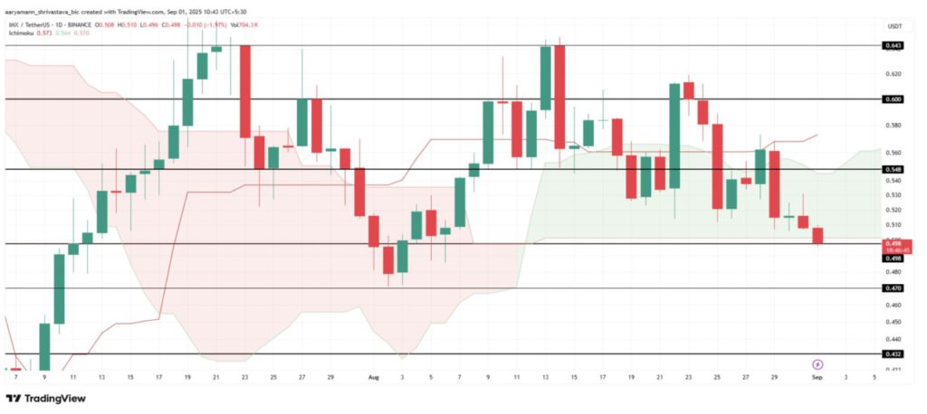 Immutable telah mengalami tren penurunan dalam beberapa minggu terakhir dan saat pada awal September 2025 sempat diperdagangkan di harga $0,498. Harga ini sedang menguji level tersebut sebagai support, menjadikannya zona krusial bagi altcoin ini.