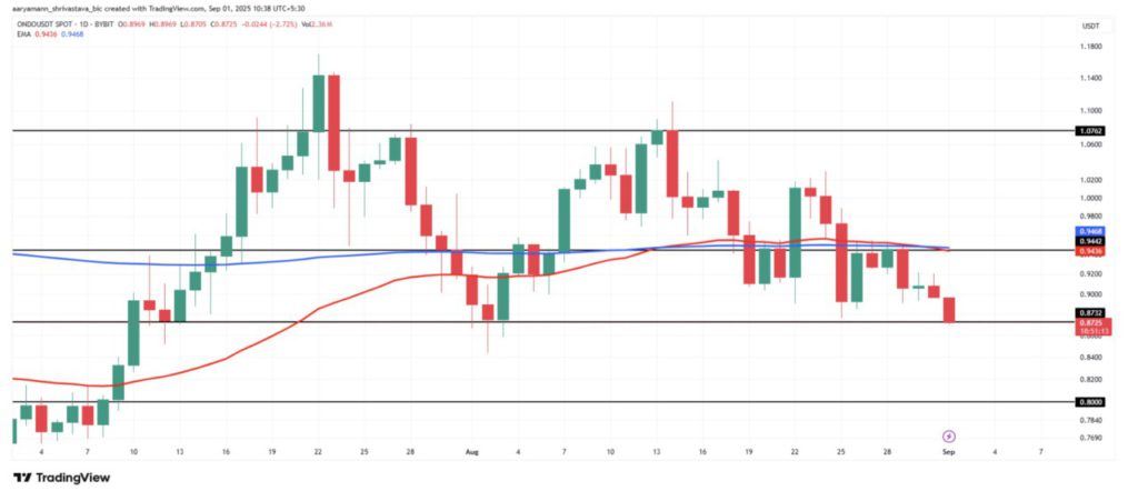 Pada awal September 2025, Ondo sempat diperdagangkan di harga $0,872, sedikit turun di bawah level support $0,873. Altcoin ini menunjukkan tanda-tanda bearish ringan, ditandai dengan terbentuknya pola Death Cross pada indikator exponential moving averages. Indikator teknikal ini merupakan sinyal kehati-hatian, yang menunjukkan potensi tekanan turun lebih lanjut.