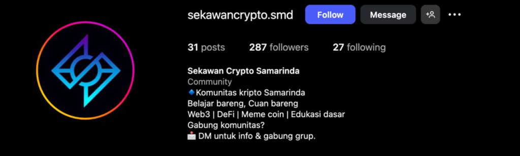 Sekawan Crypto Samarinda adalah komunitas trader Samarinda yang cukup populer. Komunitas ini berfokus pada pembelajaran seputar dunia Web3, DeFi, meme coin, dan banyak topik lainnya terkait cryptocurrency. Dengan tujuan ābelajar bareng, cuan barengā, Sekawan Crypto menawarkan platform bagi para trader di Samarinda untuk berbagi ilmu dan strategi investasi.