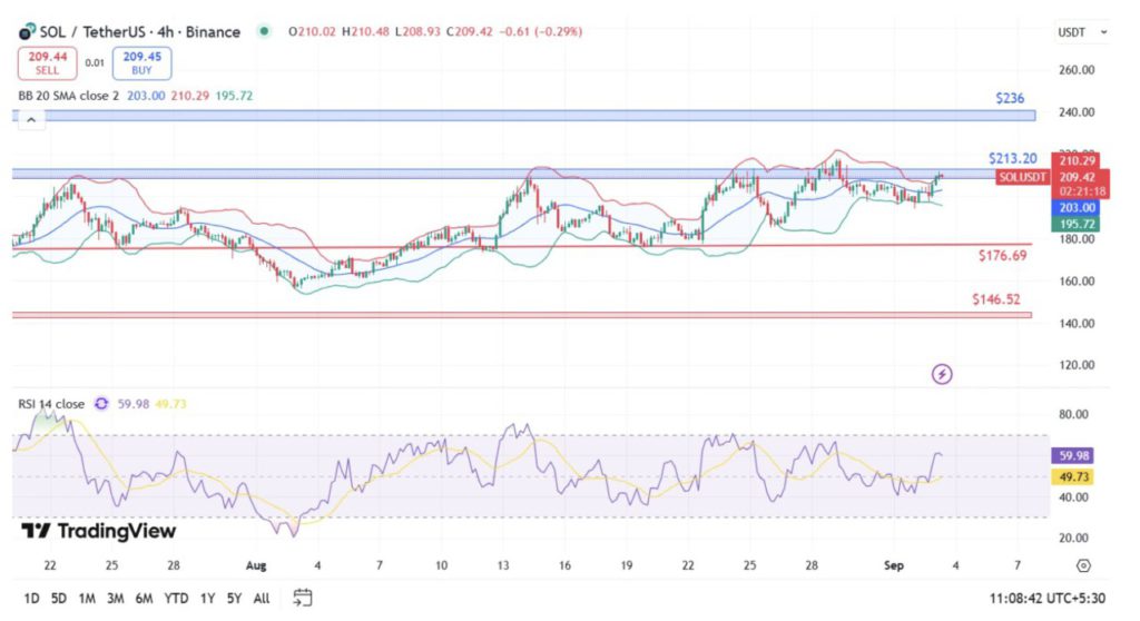 Dilansir dari Coinpedia (3/8), harga SOL telah berhasil menembus SMA 7 hari di $204,69 dan EMA 30 hari di $192,23. Pergerakan di atas $210 memicu perintah stop-loss dan pembelian algoritmik, yang mendorong harga menuju resistansi jangka pendek.