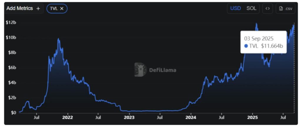 Aktivitas on-chain Solana terus menunjukkan perkembangan yang kuat, dengan TVL (Total Value Locked) mencapai $11,66 miliar pada 3 September 2025, level tertinggi dalam lebih dari dua tahun.